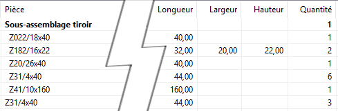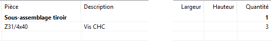 La boite de dialogue Nomenclature prend en charge les structures hiérarchiques tels que les sous-assemblages. Les entrées peuvent être :