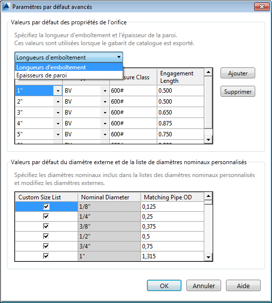 Définit des valeurs par défaut avancées, telles que l'épaisseur de paroi, la longueur d'insertion et le diamètre extérieur. Vous pouvez également spécifier une liste de diamètres nominaux personnalisée.
