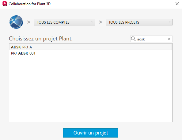 Une liste des projets de Plant Collaboration auxquels vous avez accès s’affiche. La liste déroulante située à gauche (au-dessus des projets Plant) affiche les comptes Autodesk Docs auxquels vous avez accès. La liste déroulante située à droite affiche les dossiers de projet Autodesk Docs auxquels vous avez accès dans ce compte.