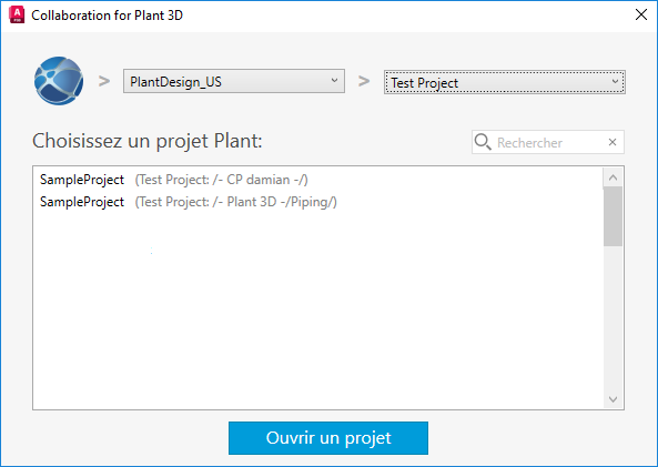 Lors de l’ouverture d’un projet de collaboration, vous pouvez sélectionner un projet Plant 3D dans le compte Autodesk Docs, à condition de disposer des autorisations d’accès nécessaires.