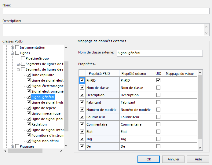 Modifie le nom, la description, les sélections et les mappages des objets et des propriétés P&ID.