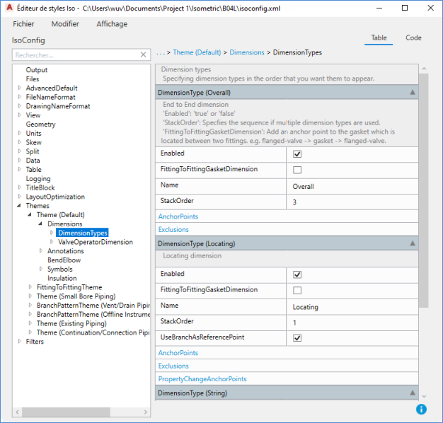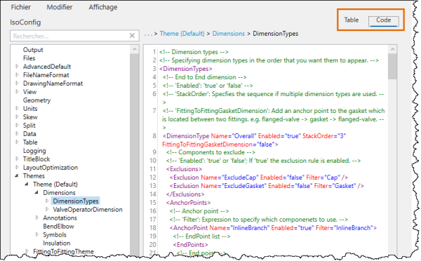 L’éditeur de styles ISO affiche le fichier IsoConfig.xml correspondant pour la personnalisation isométrique avancée. Dans la boîte de dialogue Configuration du projet, page Paramètres ISO, cliquez sur