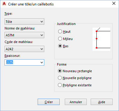 Spécifie la forme de la tôle ou du caillebotis. Les options sont Nouveau rectangle, Nouvelle polyligne et Polyligne existante.