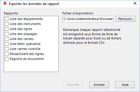 Permet d'exporter les rapports sélectionnés vers les fichier et dossier spécifiés. Chaque type de rapport sélectionné est exporté vers une feuille de calcul séparée d'un fichier Excel ou vers un fichier CSV individuel.