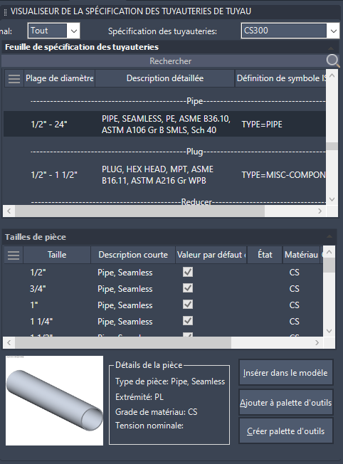 Affiche la spécification des tuyauteries courante dans AutoCAD Plant 3D toolset et permet d'ouvrir et d'afficher une feuille de spécification des tuyauteries, d'insérer des pièces de cette feuille dans un modèle, ainsi que de modifier les palettes d'outils.