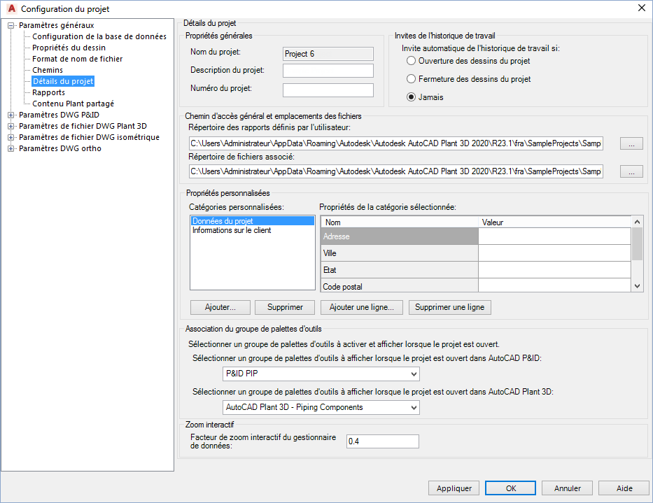 Définit les catégories du projet. Les catégories Données du projet et Informations sur le client sont complétées par défaut.