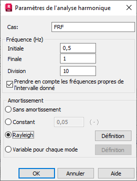La boîte de dialogue Paramètres de l'analyse harmonique (FRF) sert à définir les paramètres de l'analyse des vibrations harmoniques dans le domaine de fréquence (FRF) pour un cas de charge.