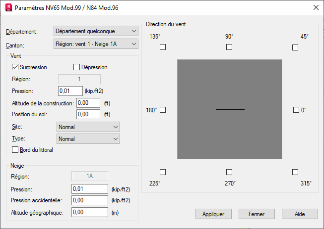 - La partie gauche de la boîte de dialogue contient les options de définition des valeurs des paramètres des charges de neige et de vent qui permettent de générer automatiquement les cas de charges climatiques sollicitant la structure. Il s'agit des paramètres standard de génération des charges de neige et vent pour une structure, par exemple un portique 2D.