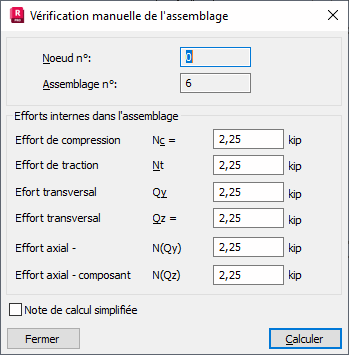 - Effort de compression Nc : entrez la valeur de l'effort de compression pour l'assemblage.