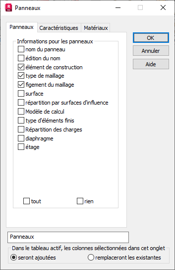 Utilisez la boîte de dialogue Panneaux pour sélectionner les informations relatives aux panneaux qui s'affichent dans le tableau.
