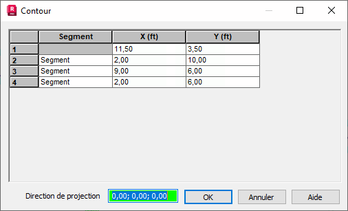 dans la boîte de dialogue Polyligne - contour. Toutes les coordonnées et les paramètres des contours s'affichent sous forme de tableau. Les paramètres présentés dans le tableau sont les paramètres du contour actuellement actif dans la boîte de dialogue Polyligne - contour.