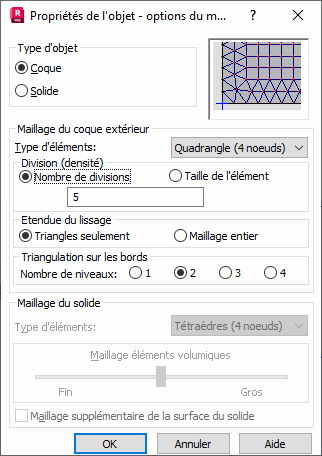 Les options disponibles dans la boîte de dialogue ci-dessous permettent de définir les paramètres des maillages par EF surfaciques ou volumiques. L’option est disponible dans les modules Etude d’une Coque et Modélisation en volumique après la sélection de l’objet et de la commande Propriétés de l’objet dans le menu contextuel.