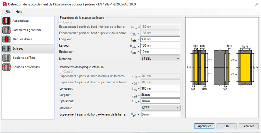 - Eclisses de droite et Eclisses de gauche pour les raccordements de l'épissure de poteau à poteau