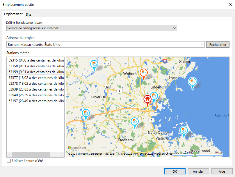 Les stations météo disponibles s'affichent sur la carte et dans la liste de gauche. En général, vous devez sélectionner une station météo proche de votre emplacement. Toutefois, vous pouvez sélectionner une station météo proche dont l'élévation et les caractéristiques de terrain et d'eau reflètent mieux l'emplacement du modèle.
