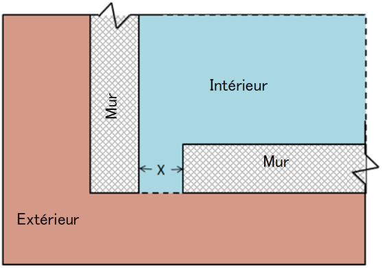 Ce concept peut être présenté comme suit, où la vue en plan montre deux murs délimitant un espace intérieur, séparés par un espace de cote X.