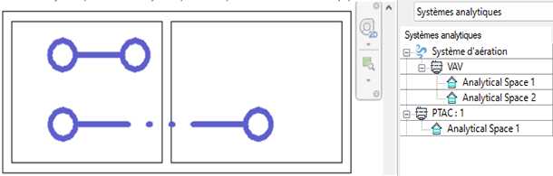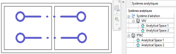 - Une configuration incorrecte est illustrée ci-dessous. Les éléments Espace analytique 1 et Espace analytique 2 figurent dans l'équipement de zone Débit d'air variable, mais l'élément Espace analytique 2 ne figure pas dans le climatiseur terminal autonome.