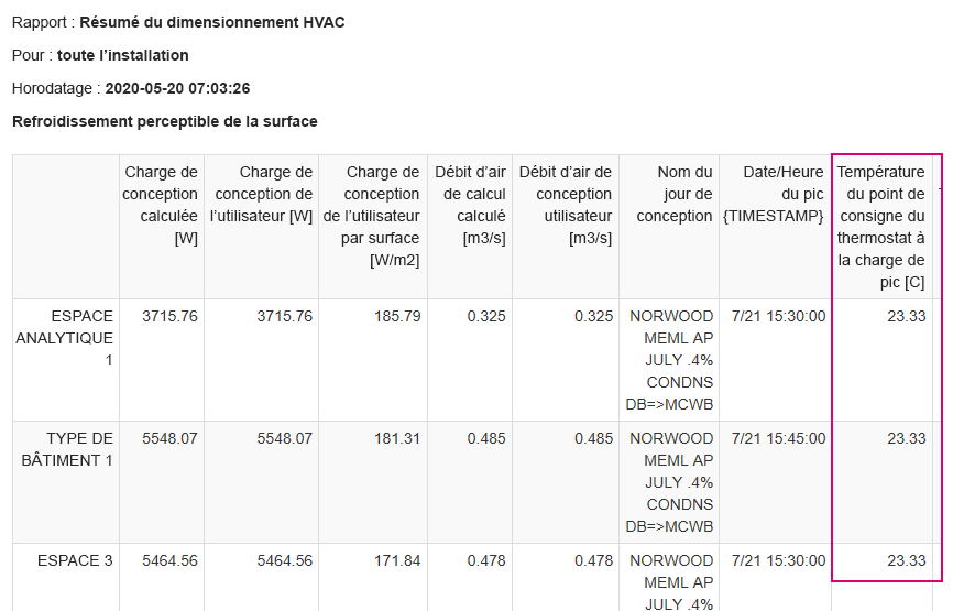 Ces points de consigne sont utilisés lors de l’exécution d’une analyse des systèmes. Après l’exécution d’une analyse du dimensionnement, les points de consigne du chauffage et du refroidissement s’affichent dans le résumé du dimensionnement CVC du rapport d’analyse.