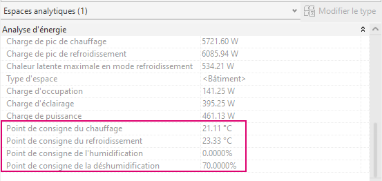 Une fois le modèle énergétique créé, les points de consigne dans les paramètres Type de bâtiment sont appliqués aux espaces analytiques et s’affichent en lecture seule dans la palette Propriétés.