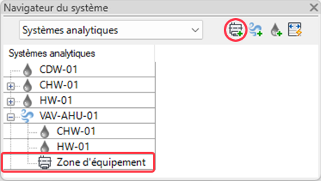 Le navigateur du système affiche la hiérarchie des équipements de zone et des systèmes analytiques.