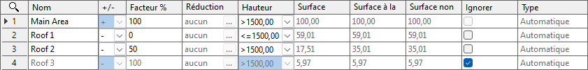 - Toit 1 : indique les données de sous-surface pour la surface située au-dessous de la ligne de hauteur de 1 m. La surface est soustraite de la surface principale (facteur de calcul : 0 %).