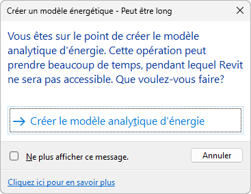 Cette boîte de dialogue permet d’éviter de lancer par inadvertance le processus de création de modèle analytique d’énergie. Cochez la case pour ignorer ce message à l’avenir.
