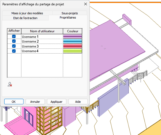 Paramètres d'affichage du partage de projet. La couleur spécifiée pour le propriétaire correspondant s'affiche dans le modèle.