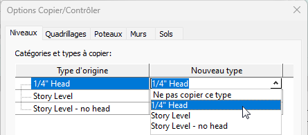 | empêcher que Revit copie des éléments d'un certain type | Recherchez le type d'élément dans la colonne Type d'origine. Sur la même ligne de la colonne Nouveau type, sélectionnez Ne pas copier ce type. |