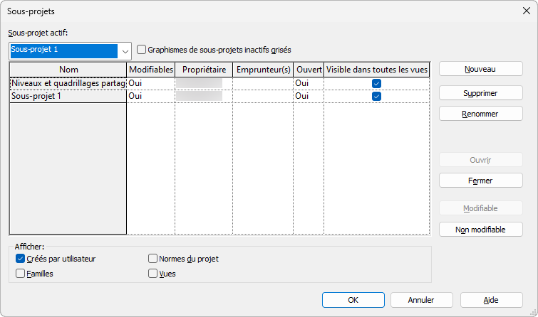 L'image suivante illustre la boîte de dialogue Sous-projets avec les deux sous-projets utilisateur par défaut, Quadrillages et niveaux partagés et Sous-projet 1.