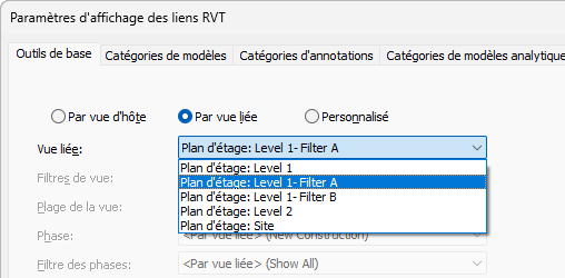- Dans l'onglet Outils de base de la boîte de dialogue Paramètres d'affichage des liens RVT, effectuez les opérations suivantes :