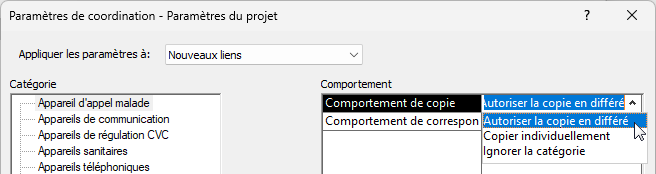 Avant ou lors de la copie d'appareils à partir d'un modèle lié vers un modèle MEP, spécifiez le comportement de copie de chaque catégorie d'appareils dans la boîte de dialogue Spécification des paramètres de coordination.