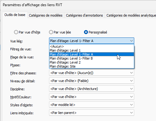 - Dans l’onglet Outils de base de la boîte de dialogue Paramètres d’affichage des liens RVT, effectuez les opérations suivantes :
