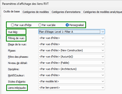 | Par vue d'hôte | Applique le filtre (et d'autres paramètres de visibilité/graphismes) pour la vue d'hôte aux éléments du modèle hôte, du modèle lié et des modèles imbriqués.
