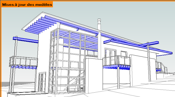 Dans l'exemple illustré ici, la vue affiche les éléments de modèle qui doivent être synchronisés avec le modèle central. Les vues en mode d'affichage du partage de projet affichent les bords en couleur et le nom du mode d'affichage appliqué (Mises à jour des modèles), comme illustré ici. Vous pouvez désactiver ou modifier le mode d'affichage à tout moment.
