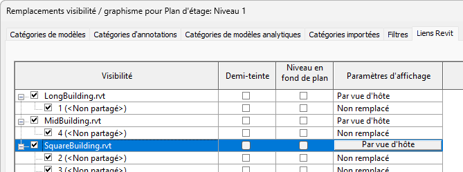Paramètres d'affichage : options permettant de remplacer des paramètres supplémentaires pour chaque modèle lié dans la vue d'hôte active. Le bouton affiche l'état actuel des paramètres d'affichage (Par vue d'hôte, Par vue liée ou Spécifique).