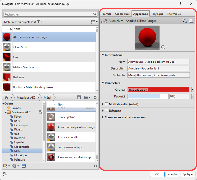 Dans le navigateur de matériaux, les informations s'affichent dans les onglets Identité, Graphismes et Apparence de l'Editeur de matériaux.