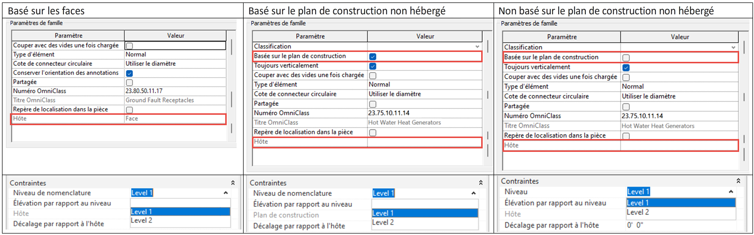 La définition de contenu a également un impact sur la propriété de niveau disponible. Une valeur de propriété de niveau de nomenclature existe pour les éléments basés sur les faces et le plan de construction, hébergés et non hébergés. Les éléments non hébergés et non basés sur le plan de construction n'ont pas de propriété de niveau de nomenclature, mais une propriété de niveau, comme décrit dans le tableau suivant :