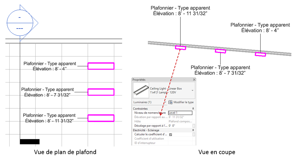 Le paramètre Élévation par rapport au niveau n'est pas modifiable lorsque l'élément est placé sur une surface non verticale, comme lorsque vous placez une prise de courant sur le sol ou un luminaire au plafond.