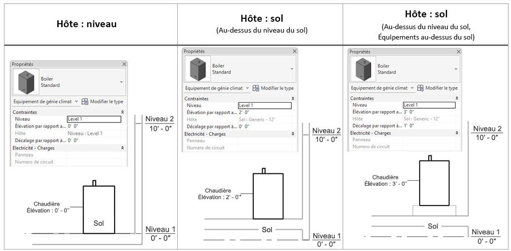 Dans l'exemple ci-dessous, le sol est 2' 0" au-dessus du niveau. Lorsque la chaudière est placée sur le sol, l'élévation par rapport au niveau est de 2' 0", et le décalage par rapport à l'hôte est de 0' 0".