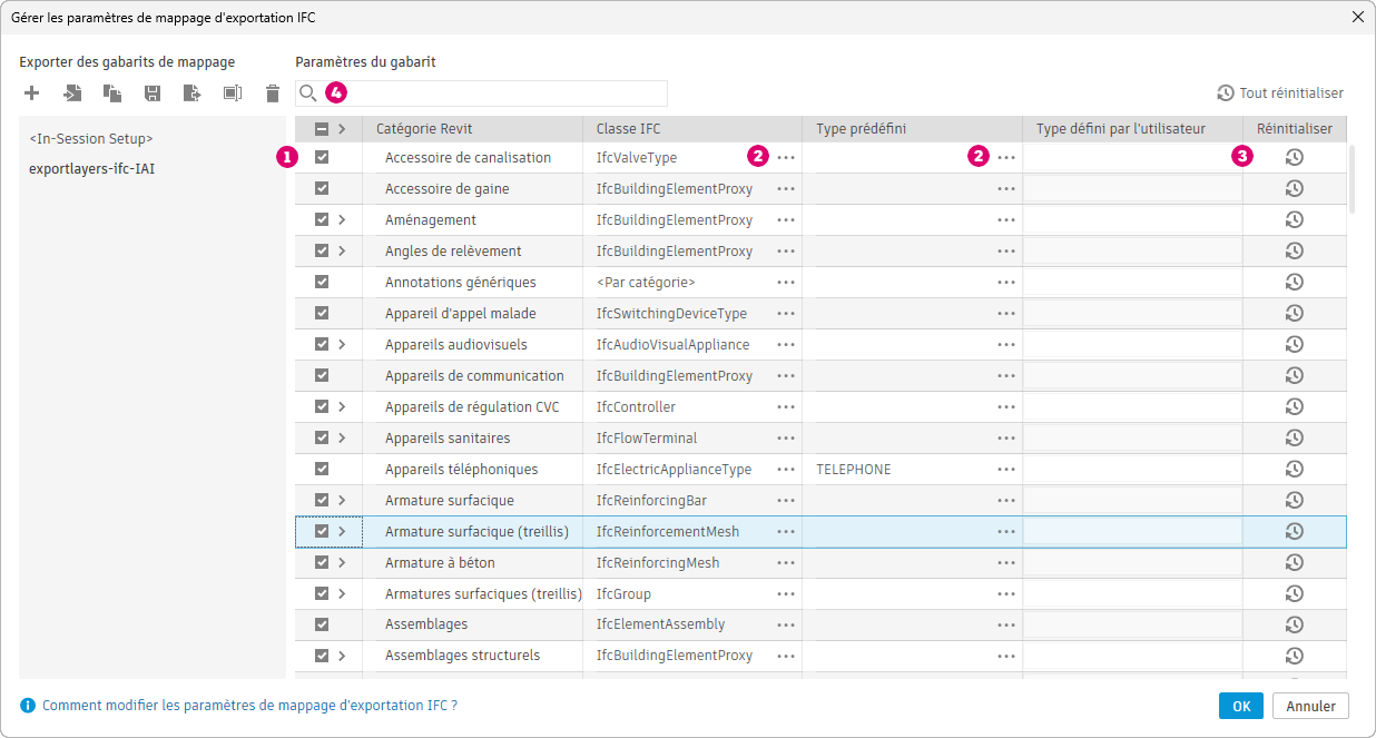 Apportez des modifications à la classe IFC et aux types prédéfinis mappés à chaque catégorie Revit lors de l’exportation d’un fichier IFC.