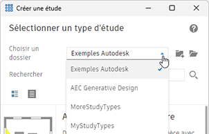 Lorsque vous sélectionnez un dossier dans la liste, la boîte de dialogue Créer une étude répertorie les types d’étude disponibles.