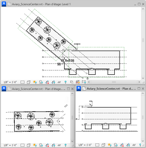Par exemple, dans la vue située dans la partie supérieure de l'illustration ci-dessous, des zones de définition s'affichent autour du bâtiment principal et de l'aile aviaire. La zone de définition 1 a été appliquée aux lignes de quadrillage du bâtiment principal, tandis que la zone de définition 2 a été appliquée aux lignes de quadrillage de l'aile aviaire. Ainsi, seules les lignes de quadrillage appliquées à la partie adéquate du bâtiment s'affichent dans chacune des vues dépendantes (partie inférieure de l'illustration).
