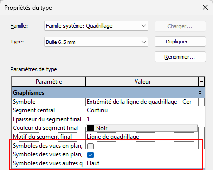 - Pour afficher les bulles de quadrillage au point de départ des lignes de quadrillage dans une vue en plan, sélectionnez Symboles des vues en plan, extrémité 1 (par défaut).