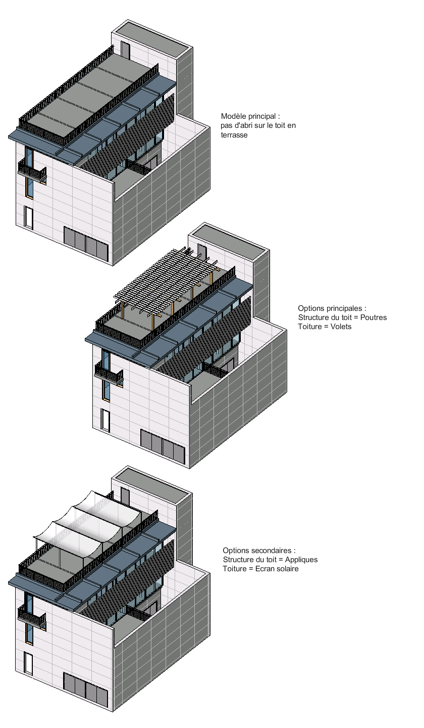 Les variantes servent à étudier plusieurs concepts au cours du développement du projet. A tout stade de la conception, vous pouvez utiliser différents jeux de variantes. Souvent, chaque jeu de variantes répond à un besoin spécifique ou correspond à un domaine particulier. Par exemple, pour examiner les configurations possibles d'une pergola et d'un écran solaire pour un toit en terrasse, vous pouvez créer un jeu de variantes appelé Toiture contenant diverses variantes de toitures (Ecran solaire ou Grilles d'aération). En outre, vous pouvez créer un jeu de variantes appelé Structure de toit contenant diverses variantes de structure (Appliques ou Poutres). Après avoir sélectionné le modèle final, incorporez les variantes choisies au modèle de base et supprimer les autres options.