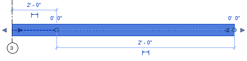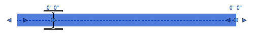 Cliquez sur les poignées de forme et faites-les glisser pour modifier manuellement la géométrie de l'extension de fin de la poutre. Les extensions de fin s'étendent au-delà de la ligne de justification et des poignées de fin (cercles bleus) de l'élément de structure. Cela permet de définir les valeurs des paramètres Extension de fin et Extension de départ en conséquence.