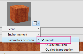 Lorsque vous travaillez dans l'onglet Apparence du navigateur de matériaux, utilisez le menu déroulant situé en regard de la miniature du matériau pour configurer les paramètres de rendu de l'image miniature. Le paramètre de rendu « Rapide » qui vient d'être ajouté accélère la génération de l'image miniature lorsque vous modifiez votre sélection de matériaux.