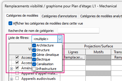 Suite aux commentaires des clients, les filtres de discipline de la boîte de dialogue Remplacements visibilité/graphisme ont été mis à jour.