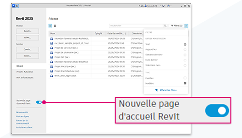 La nouvelle page d’accueil Revit est désormais activée par défaut à l’ouverture de Revit.
