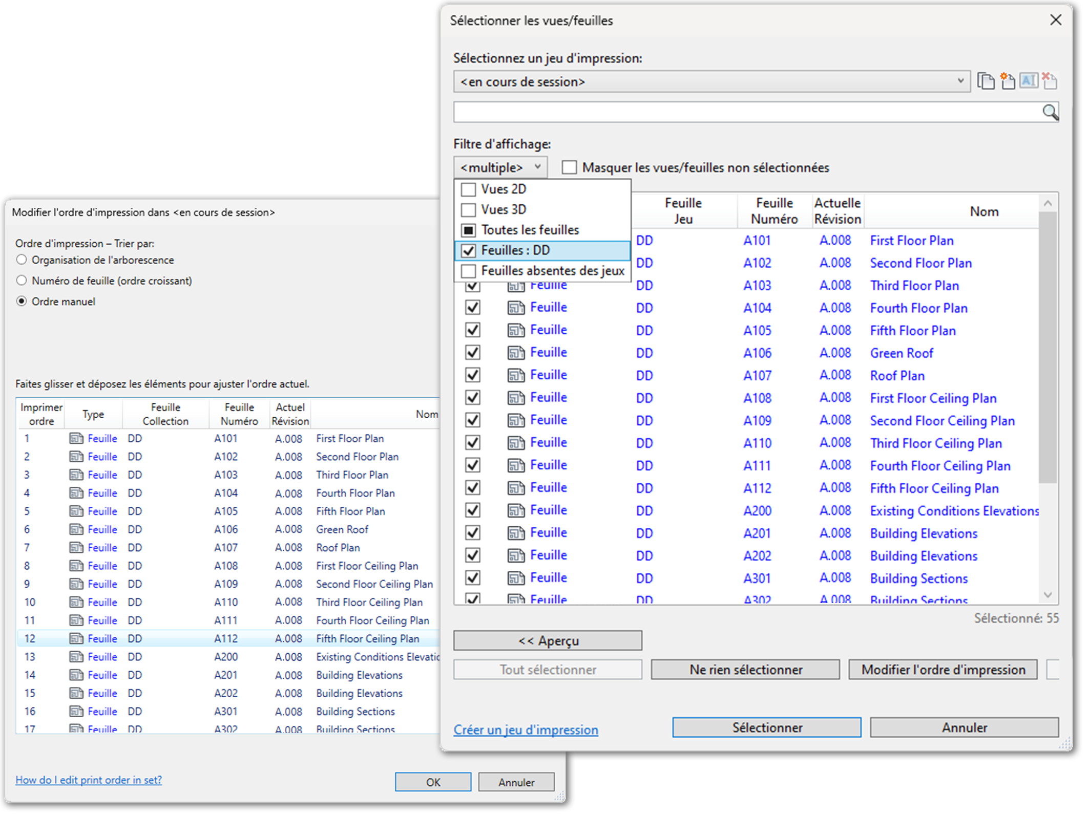 La sélection de vues et de feuilles est plus facile grâce à l'ajout de colonnes supplémentaires pour l'ensemble de feuilles, le numéro de feuille et la révision actuelle dans la boîte de dialogue. Les exportations de PDF ont été améliorées afin d'être plus rapides et plus précises.
