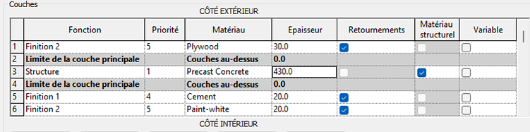 Utilisez la boîte de dialogue Modifier l'assemblage pour définir les propriétés de chaque couche de mur. Les propriétés de chaque couche de mur sont les suivantes :
