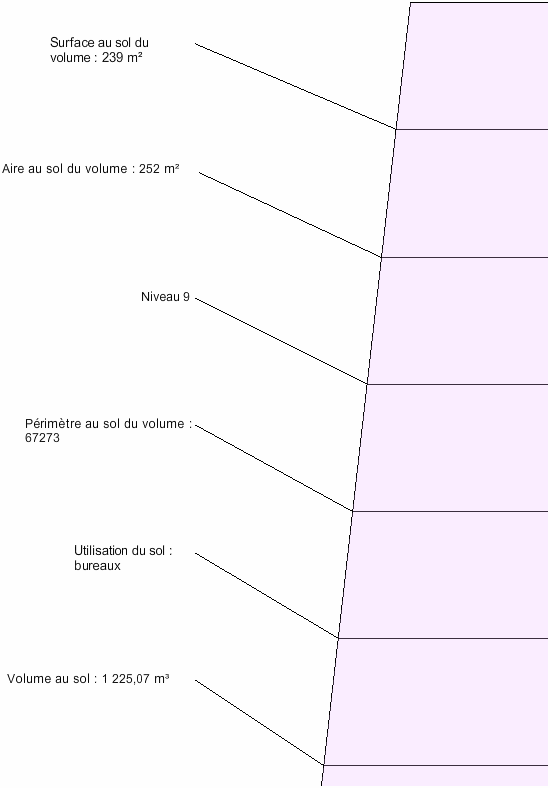 Après avoir créé des sols de volumes, vous pouvez les étiqueter dans des vues 2D. Les étiquettes peuvent contenir des informations relatives à la surface, le développé de façade, le périmètre, le volume et l'utilisation de chaque sol de volume.